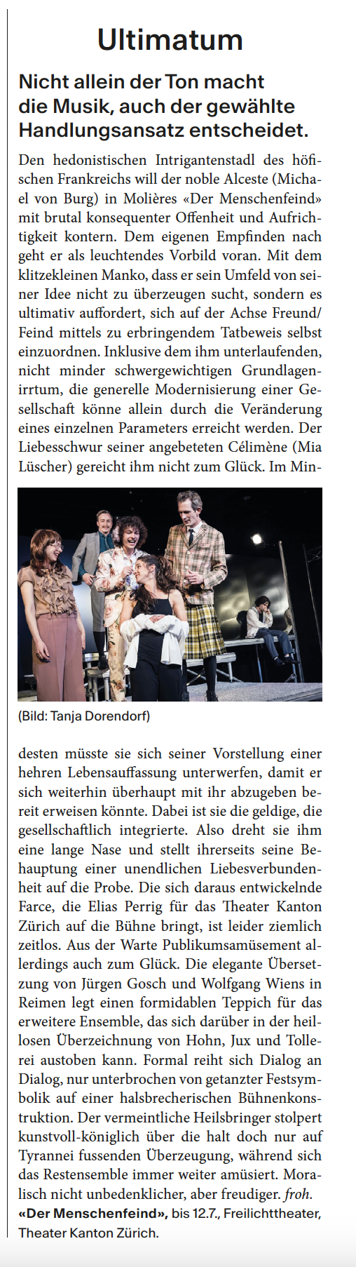 Alceste, ein Misanthrop par excellence, ist ein anstrengender Zeitgenosse. Einerseits verachtet er nichts mehr als Heuchelei, Lüge oder Verstellung und sehnt sich nach einer bedingungslos ehrlichen Welt. Andererseits umgibt er sich mit schrillen und aufdringlichen Menschen, die unaufhörlich um Aufmerksamkeit und Ansehen buhlen und sich gegenseitig mit Schmeicheleien und Koketterien zu überbieten versuchen. Für Alceste gibt es immer nur eine Wahrheit, die über allem steht. Sein fanatisches Bestreben danach macht ihn bei seinen Zeitgenossen nicht gerade beliebt. Da ist aber noch seine Liebe zur jungen und schönen Witwe Célimène, die sich in der Welt der Eitelkeiten und Intrigen bestens auskennt. Sie wiederrum hält nicht so viel von der einen und wahren Liebe, zum grossen Missfallen Alcestes. Ein emotionales Intrigenspiel mit scharfzüngigen Dialogen und aberwitzigen Wendungen nimmt seinen Lauf.