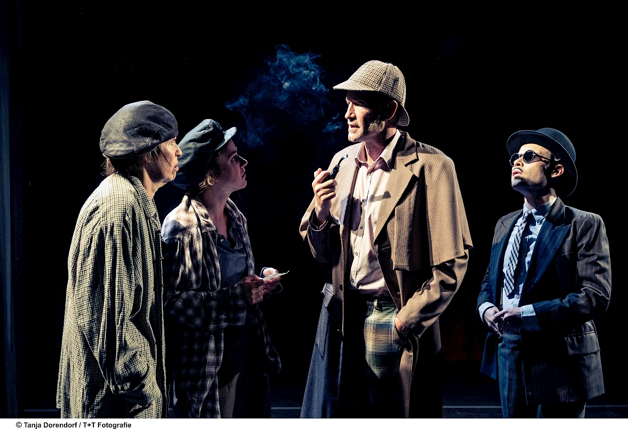 Fünf Schauspielende in über 20 Rollen in einem spannenden und humorvollen Krimi, der mit witzigen theatralen Mitteln die ganze Welt von Sherlock Holmes auf der Bühne ausbreitet.